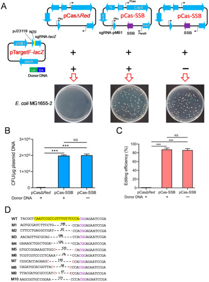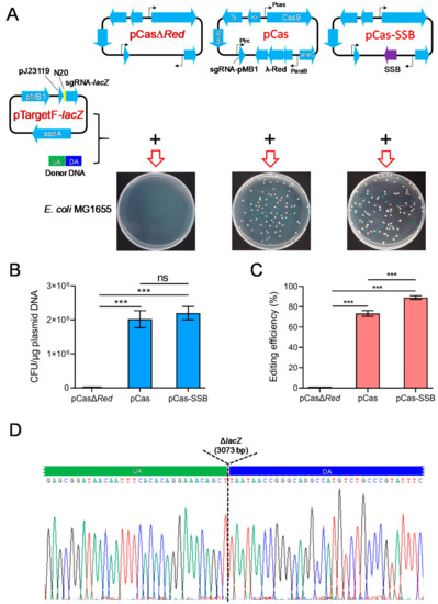 Comparison of CRISPR/Cas9 gene editing to delete the E. coli lacZ gene, assisted by SSB- and λ-Red recombination system-mediated HR repair of DSBs. (A) Schematic representation of the CRISPR-Cas9 two-plasmid system and the results of transforming the two plasmids into E. coli MG1655. LB plates were used containing X-gal, IPTG, kanamycin, and spectinomycin. pCas harbors Streptococcus pyogenes Cas9 under its native promoter Pcas, the λ-Red recombination system (λ-Red) with the arabinose-inducible promoter ParaB and arabinose-inducible transcription factor (araC), sgRNA-PMB1 with an IPTG-inducible promoter (Ptrc) guiding the pMB1 replication of pTarget for eliminating pTargetF, the lac repressor (lacIq), the temperature-sensitive origin of replication repA101 (Ts), and kanamycin resistance gene (Kr); pCasΔRed is derived from pCas by deletion of λ-Red; and pCas-SSB is derived from pCas by replacing λ-Red recombinases with E. coli SSB. pTargetF-lacZ contains sgRNA-lacZ with the efficient constitutive promoter pJ23119 targeting lacZ guided by N20 (Table 2), aadA conferring spectinomycin resistance and the pMB1 replicon; and the donor DNA contains an upstream homologous arm (UA) and a downstream homologous arm (DA) that are homologous to each side (upstream or downstream) of the lacZ gene in the E. coli genome. (B) The transformation rate of the CRISPR-Cas9 two-plasmid system into E. coli MG1665. (C) The editing efficiency of CRISPR-Cas9 to delete the E. coli lacZ gene. (D) Identification of the 10 randomly selected lacZ mutant colonies (white colonies) by colony PCR and DNA sequencing. The data in (B,C) represent the mean ± s.d. for n = 3 biologically independent samples. ***, p < 0.001 by one-way ANOVA followed by Dunnett’s test; ns, no significant differences.
