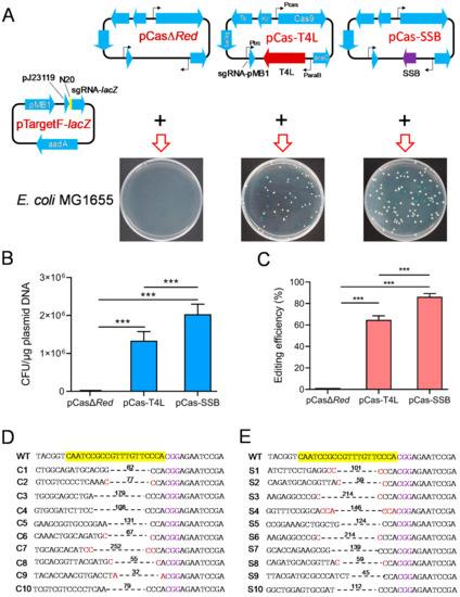 Effects of SSB- and T4 DNA ligase-mediated NHR repair of DSBs on CRISPR-Cas9 gene editing to delete the E. coli lacZ gene. (A) Illustration of Cas9 and sgRNA expression plasmids and their transformation into E. coli MG1655. pCas-T4L is derived from pCas by replacing λ-Red recombinases with phage T4 DNA ligase. (B) The transformation rate of the CRISPR-Cas9 plasmids into E. coli MG1665. (C) The editing efficiency of CRISPR-Cas9 to delete the E. coli lacZ gene. (D) Identification of the 10 randomly selected white colonies generated by pCas-T4L and pTargetF-lacZ transformation by colony PCR and sequencing. (E) Identification of the 10 randomly selected white colonies generated by pCas-SSB and pTargetF-lacZ transformation by colony PCR and sequencing. The sequences highlighted in yellow represent a 20-bp complementary region (N20) matching with the E. coli lacZ gene. The sequences colored in purple indicate the PAM sequence of Cas9. The sequences colored in red are micro-homology sequences. The dotted lines and associated numbers indicate the deleted sequences and deletion sizes (bp). WT, E. coli MG1665; C1-C10 or S1-S10, the 10 randomly selected white colonies. The data in (B,C) represent the mean ± s.d. for n = 3 biologically independent samples. *** p < 0.001 by one-way ANOVA followed by Dunnett’s test; ns, no significant differences.