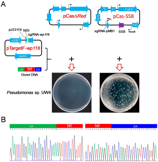 CRISPR-Cas9 editing of the Pseudomonas sp. UW4 wp116 gene assisted by SSB-mediated HR repair of DSBs. (A) Illustration of the plasmid expression of Cas9 and sgRNA targeting the wp116 gene and their transformation into Pseudomonas sp. UW4. (B) Identification of the 10 randomly selected transformant colonies of Pseudomonas sp. UW4 by colony PCR and DNA sequencing. UA, upstream homologous arm, homologous to the upstream region of the wp116 gene in the UW4 genome; DA, downstream homologous arm, homologous to the downstream region of the wp116 gene in the UW4 genome; tet, tetracycline resistance gene.