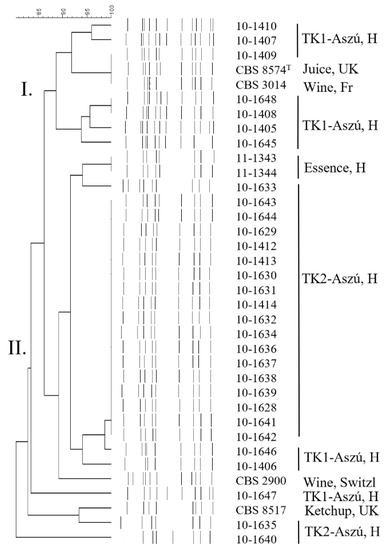 Amplification with Microsatellite primer (GTG)5 generated complex banding patterns, with 8–12 electrophoretic bands, ranging in size from 250 to 5000 bp. Data showed a total of 16 patterns for the 36 examined Z. lentus strains (our isolates and the four collection strains) (Table S1). The strains, except 10-1640, were grouped in two main clusters on the UPGMA dendrogram at a similarity level of 89% (Figure 1). Seventeen strains isolated from TK-2 Aszú wine in cluster II possessed similar band patterns.