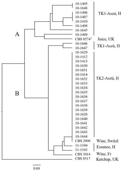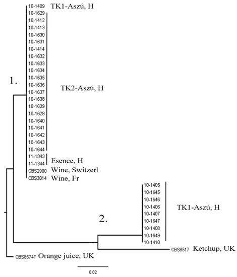 The strains isolated from TK2-Aszú wine 10-1412, 10-1413, 10-1414, 10-1628, 10-1629, 10-1630, 10-1631, 10-1632, 10-1634, 10-1636, 10-1637, 10-1638, 10-1639, 10-1641, 10-1642, 10-1643, and 10-1644 have the same molecular profile, which may refer to clonal relationships among these strains. This can also be seen in the UPGMA analysis shown in Figure 4, where the mentioned clonal population, the strains isolated from the Tokaj Essence, the French strain, and the Swiss strain are grouped into cluster ‘B’, like the ‘1’ group separated in the mtDNA analysis.
