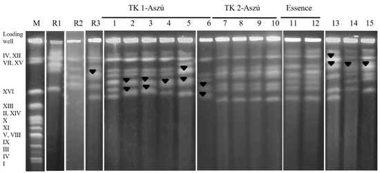 Comparative electrophoretic karyotyping patterns of 11 Z. lentus strains analysed. Lane M CHEF marker S. cerevisiae S288.c; lane R1 Z. rouxii CBS 732T; lane R2 Z. bailii CBS 680T; R3 Z. lentus CBS 8574T from orange juice, UK; lanes 1-6 strains 10-1405, 10-1406, 10-1407, 10-1408, 10-1409, and 10-1410 from TK 1-Aszú wine, Tokaj; lanes 7-10 strains 10-1412, 10-1413, 10-1414, and 10-1628 from TK 2-Aszú wine, Tokaj; lanes 11-12 strains 11-1343 and 11-1344 from Essence, Tokaj; lane 13 strain CBS 8517 from ketchup, UK; lane 14 strain CBS 3014 from wine, France; lane 15 strain CBS 2900 from wine, Switzerland. Bands showing double thickness are indicated with a black triangle. Chromosomes are labelled with Roman numerals according to the S. cerevisiae nomenclature.
