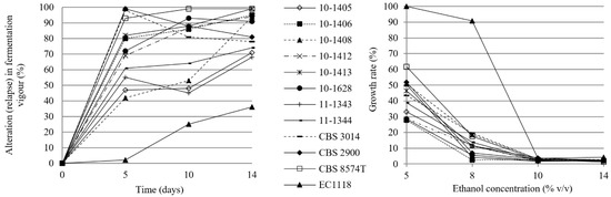 The ability of Z. lentus strains to grow at different concentrations of ethanol (5%, 8%, 10%, and 14%, v/v) during 21 days of incubation at 13 °C was also investigated. The growth was determined by comparing the growth with and without ethanol. Considering ethanol resistance at 13 °C, all the strains grew only at 5% v/v ethanol (Figure 5). The growth rate of some Z. lentus isolates at 8% v/v of ethanol still reached 10% of that of the control (experiment in alcohol-free synthetic must).
