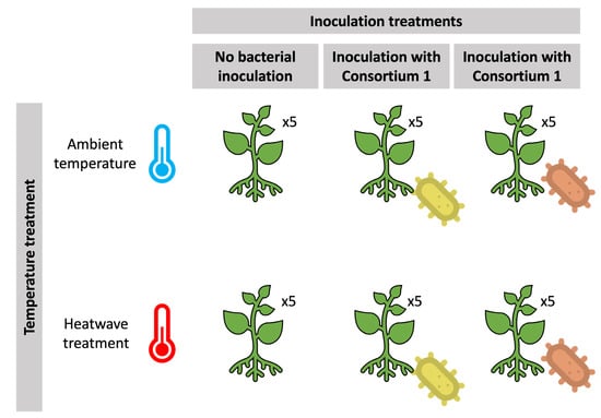 Following the acclimation period, plants were divided into three groups for root inoculation. Each pot of the inoculated groups was watered with 50 mL of the respective and above-mentioned consortia solution and diluted with distilled water to achieve a concentration of 107 CFU mL−1. Each pot in the non-inoculated group was watered with 50 mL of distilled water. This procedure was completed three times: 45, 15 and 7 days before the experiment started. After inoculation, V. vinifera individuals from each group were divided and exposed to two thermal treatments: control (25/21 °C day/night) and heatwave treatment (42/38 °C day/night) for 5 days, as seen in the experimental design (Figure 1). All treatments consisted of 5 replicate plants. Heatwave simulation was performed following a widely used and established definition found in the literature [37,38] and, as employed in previous studies [11,14], in controlled-environment chambers (Aralab/Fitoclima 18.000 EH, Lisbon, Portugal) with a light intensity of 300 μmol m−2 s−1, 70 ± 5% relative humidity and watered every two days with distilled water.