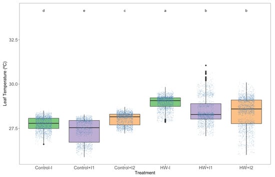 At the end of the exposure trials, thermal images were obtained with a FLIR E50bx infrared camera (FLIR Systems, Inc., Wilsonville, OR, USA), producing images of 320 × 240 resolution with an accuracy of ±0.045 °C. Ten leaves were randomly selected from plants of both treatments; a water container at room temperature was kept near the leaves as a reference. The average temperature of each leaf was calculated on each image. All image processing and analysis were performed in FLIR Tools software (version 6.4.18039.1003, FLIR Systems Inc., Wilsonville, OR, USA).