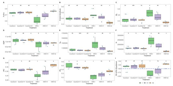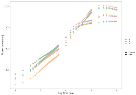 The Kautsky plots (Figure 3) from the in vivo iPAM fluorometric analysis showed a contrast between the thermal treatments’ observable fluorescence induction curves. Plants exposed to control temperature from all three groups presented very similar and high fluorescence levels with typical inflection points of standard OJIP curves. In comparison, lower fluorescence values were evidenced in the HW-exposed plants. Within the HW-treated groups, a higher relative fluorescence variation was seen, evident in the K-step (300 ms) dissociation, observably higher in the non-inoculated plants and lower in the C2-inoculated plants. Non-inoculated plants presented lower maximum fluorescence.