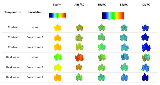 The fluorescence images obtained from the dark-adapted leaves of tested plants can reveal the PGPR implication in the experimental heatwave event (Figure 4). Under normal temperature conditions, the observed parameters were shown to be relatively similar between the different plant groups. However, under heatwave treatment, differences were exacerbated between plant inoculation treatments. When compared to control condition grapevines, HW-exposure was found to be lower in PS II quantum yield (Fv/Fm) and higher in the dissipated (DI0/RC) and absorbed (ABS/RC) energy fluxes in both non-inoculated and, less so, in C1-inoculated individuals. In overall imaging PAM-derived parameters, C2-inoculated plants under heatwave treatment appeared identical to their control counterpart.
