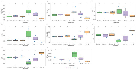 The statistical analysis of the reaction centre-based energy fluxes revealed a significant impact from rhizobacteria inoculation and marked trends in the heatwave conditions, as previously observed (Figure 3). Compared to the control, energy flux differences in heatwave conditions were noted in all tested groups. Heatwave-exposed non-inoculated plants presented significantly higher absorbed (ABS/RC; Figure 6A), trapped (TR/RC; Figure 6B) and dissipated (DI/RC; Figure 6D) energy fluxes. C1-inoculated plants also followed the same trend, yet variation was non-significant. In addition, inoculated plants exhibited a reduction in their electron transport energy flux (ET/RC; Figure 6C) following HW exposure. Reaction centre II density within the antenna chlorophyll bed of PS II (RC/ABS; Figure 6E) was found to be significantly higher in the C2-inoculated plants under heatwave treatment when compared to the remaining heatwave exposed groups. Heatwave exposure resulted in significantly lower performance index (PI, Figure 6F) and structural and functional index (SFI, Figure 6G) values in non-inoculated plants, whereas bioaugmented plants showed similar values to the corresponding control. As expected, a mirror image of SFI was found in the dissipation structural and functional index (SFINPQ, Figure 6H). It is noteworthy that HW-exposed non-inoculated and C2-inoculated plants revealed significant differences between them in all these parameters.