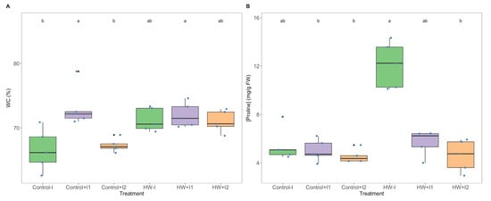 Grapevine leaf water content (WC; Figure 7A) showed no significant differences between the thermal treatments. However, at control conditions, WC was found to be significantly higher in the C1-inoculated plants. Proline content (Figure 7B) in both PGPR- bioaugmented groups under heat stress showed values similar to those observed in the corresponding control. Additionally, at heatwave conditions, non-inoculated grapevines exhibited a higher proline concentration; this difference is significant when compared to C2-inoculated plants.