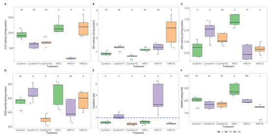 Oxidative stress biomarkers, (A) catalase (CAT), (B) ascorbate peroxidase (APx), (C) guaiacol peroxidase (GPx), (D) superoxide dismutase (SOD) activities (U mg−1 protein), (E) oxidative ratio and (F) thiobarbituric acid reactive substances (TBARS; µM MDA g−1 FW) in non-inoculated (−I) and marine PGPR consortia 1- and 2-inoculated (+I) Vitis vinifera leaves, under normal (control) thermal regimes and exposed to the heatwave (HW) (average ± standard deviation, N = 5, letter denote significant differences at p < 0.05).