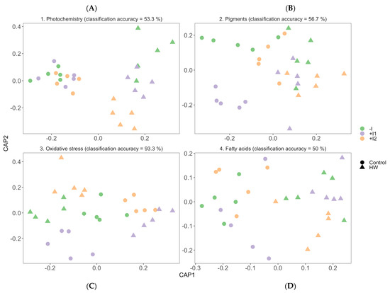Canonical analysis of principal components (CAP) was performed to highlight and evaluate the impact of PGPR inoculation on grapevine physiological response to heatwave conditions (Figure 10). The multivariate approach to the Kautsky curve dataset (Figure 10A) identified the different thermal treatments and determined the separation of the PGPR-bioaugmented groups when exposed to heatwave conditions, especially noted in the C2-inoculated group isolation. Additionally, the observed photochemical similarities between the various plant groups under normal temperature conditions resulted in the low 53.3% correct classification efficiency. Regarding photosynthetic pigment CAP analyses (Figure 10B), a high overlap was observed between the various HW-treated plants evidenced by the low classification accuracy (56.7%). However, C1-inoculated plants under control conditions were found to be differentially grouped from the remaining samples. Similarly, in the leaf fatty acid profile CAP projection (Figure 10D), despite the 50% classification efficiency, thermal sorting was evident, and HW-exposed C2-inoculated plants were distinctively identifiable. The plots based on the oxidative stress dataset allowed for the description of all tested groups, revealing a highly efficient canonical classification of 93.3% for group allocation (Figure 10C).