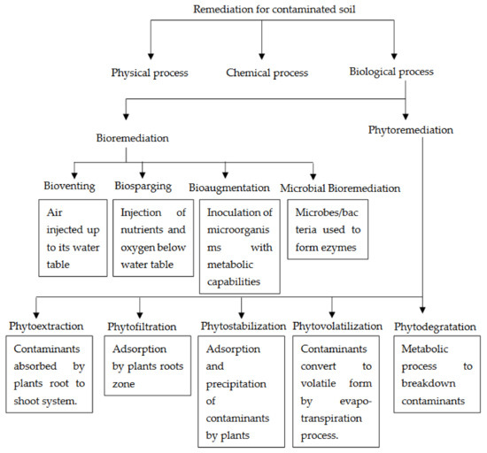 Bioremediation is a process that uses biological organisms to remove or re-treat an environmental pollutant through metabolic processes and plants to eradicate hazardous pollutants and restore the ecosystem to its original condition [9]. These strategies include natural attenuation, bioaugmentation, or biostimulation, involving microscopic organisms such as fungi, algae, and bacteria. Microorganisms are found in a variety of habitats. They thrive in soil, water, plants, animals, deep water, and ice. Biological mediation technology is widely used and is currently growing exponentially [10].
