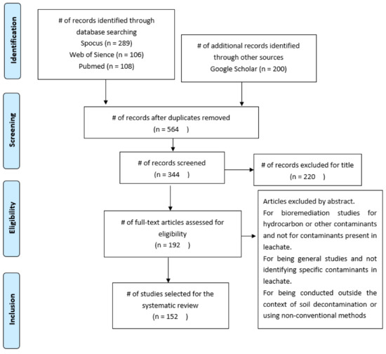 Of the 152 articles selected for this systematic review, only 21 studies deal 100% with soils contaminated with open dump leachate, showing different types of contaminants affecting the environment. These were classified according to the type of pollutant targeted for bioremediation. Therefore, it is important to understand the definition of incubation and inoculation and the isolation of bacteria. Incubation and inoculation are terms commonly used in the field of microbiology and biotechnology. Incubation refers to the process of creating optimal conditions for the growth and multiplication of microorganisms. This may include the regulation of temperature, humidity, pH, and nutrients in the culture medium. Incubation is commonly used in microbiological studies to grow microorganisms so that they can be analyzed and characterized [26,64].