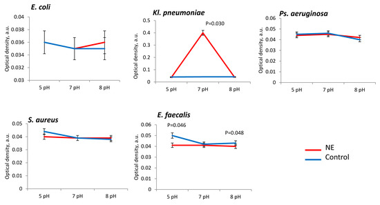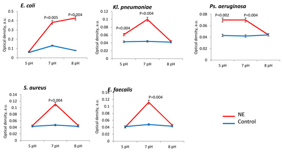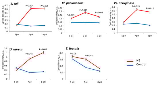 Bacterial metabolic activity was stimulated by NE in all the tested strains, especially at neutral pH 7 (Figure 5). The presence of NE at neutral (7 pH) pH range metabolism was high intensified in E. coli (in 3.5 ± 0.2 times), Ps. aeruginosa (in 1.8 ± 0.3 times), Kl. pneumoniae (in 2.5 ± 0.3 times), S. aureus (in 2.7 ± 0.4 times) and E. faecalis strains (in 2.8 ± 0.3 times) in comparison to control (Figure 6). Active stimulation of metabolism in acidic conditions (pH 5) was observed for Kl. pneumoniae (in 1.5 ± 0.2 times) and Ps. aeruginosa (in 1.8 ± 0.3 times), while in alkaline conditions (pH 8) we observed metabolic activation only in the E. coli strains (in 8.0 ± 0.4 times) (Figure 5).