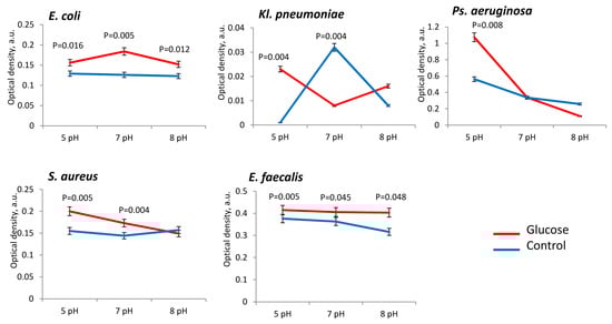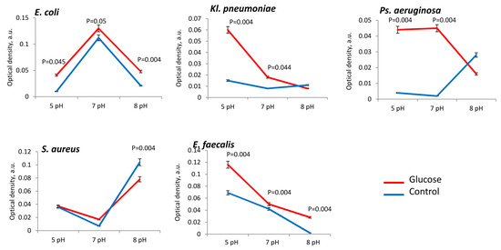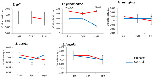 The presence of glucose in PBS also stimulated bacterial metabolism. In acidic pH (5 pH) range metabolism was high intensified in E. coli (in 4.0 ± 0.1 times), Ps. aeruginosa (in 8.2 ± 0.2 times), Kl. pneumoniae (in 4.1 ± 0.2 times) and E. faecalis strains (in 1.7 ± 0.4 times) in comparison to control (Figure 6). In neutral pH (7 pH) range in glucose presence metabolism was also activated in E. coli (in 1.2 ± 0.2 times), Ps. aeruginosa (in 8.4 ± 0.3 times), Kl. pneumoniae (in 2.2 ± 0.1 times) and E. faecalis strains (in 1.3 ± 0.1 times) in comparison to control (Figure 6). Alkaline conditions, too, allowed glucose to enhance the metabolic activity of E. coli (in 2.5 ± 0.1 times) and E. faecalis (3.5 ± 0.4 times). For S. aureus the metabolic activity showed no significant dependence on the presence of glucose but was actually inhibited in alkaline range (pH 8) in 1.5 ± 0.2 times (Figure 6).