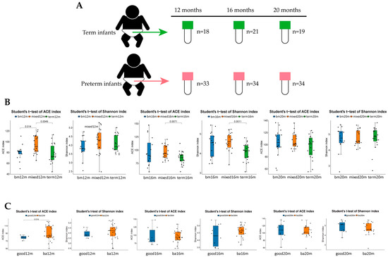 In total, 55 of 95 preterm toddlers and 22 term toddlers were enrolled. Neonatal clinical characteristics are summarized in Table 1. For neurodevelopment outcome, 44 preterm toddlers (80%) attended follow-up at 12 ± 2 months CA (11 non-available: 7 unable to contact, 2 outside Beijing, 1 unwilling to come, 1 unable to complete test) and 48 toddlers (87.3%) attended follow-up at 18 ± 2 months CA (7 non-available: 3 outside Beijing, 4 unwilling to come) as shown in Figure 1. Neonatal clinical and sociodemographic characteristics are summarized in Table 2. Participants of the 12 months CA and 18 months CA follow-up study from whom BSIDIII scores were available were comparable on baseline characteristics. For fecal samples, a total of 159 samples from 79 toddlers enrolled (33 samples from preterm toddlers and 18 samples from term toddlers at 12 months after birth, 34 samples from preterm toddlers and 21 samples from term toddlers at 16 months after birth, 34 samples from preterm toddlers and 19 samples from term toddlers at 20 months after birth) were obtained as shown in Figure 2A.