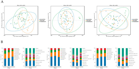 Gut microbiota community structure in each group varied by feeding mode at different sampling times. (A) Binary Jaccard distances displayed by PCoA plots at 12 months, 16 months and 20 months; (B) relative abundance at phylum level and genus level at 12 months, 16 months and 20 months. Figure legend: bm, breast milk; m, months.