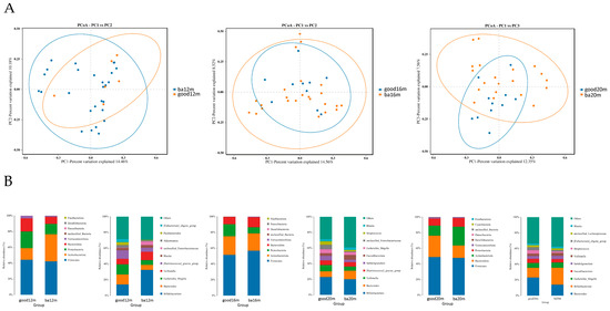Gut microbiota community structure in each group varied by language composite score at different sampling times. (A) Bray–Curtis distances displayed by PCoA plots at 12 months, 16 months and 20 months; (B) relative abundance at phylum level and genus level at 12 months, 16 months and 20 months. Figure legend: bm, breast milk; ba, below average; m, months.