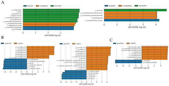 LDA by Lefse illustrating differential bacterial taxa of the gut microbiota community in each group varied by feeding mode or neurodevelopment outcomes at different sampling times. (A) differential bacterial taxa varied by feeding mode at 12 and 20 months; (B) differential bacterial taxa varied by language composite score at 12 and 20 months; (C) differential bacterial taxa varied by cognitive composite score at 12 and 20 months. Figure legend: bm, breast milk; ba, below average; m, months.