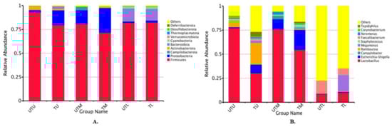 The top 10 genera in each sample type are shown in Figure 1B. The abundance of the different genera was as follows: TU: Lactobacillus (30%), “others” (27%, discussed in further detail below), Romboutsia (23%), Escherichia–Shigella (9%), Tepidiphilus (5%), Megamonas (3%), Faecalibacterium (2%), Aeromonas (1%) and Corynebacterium (1%); TM: Lactobacillus (55%), Escherichia–Shigella (21%), “others” (16%), Megamonas (2%), Staphylococcus (2%), Romboutsia (1%), Faecalibacterium (1%), Corynebacterium (1%) and Tepidiphilus (1%); TL: “others” (65%), Megamonas (17%), Lactobacillus (10%), Faecalibacterium (7%), Escherichia–Shigella (1%) and Romboutsia (1%); UTU: Lactobacillus (77%), “others” (10%), Romboutsia (7%), Corynebacterium (2%), Escherichia–Shigella (1%), Staphylococcus (1%), Aeromonas (1%) and Tepidiphilus (1%); UTM: Lactobacillus (76%), Escherichia–Shigella (11%), “others” (6%), Campylobacter (3%), Aeromonas (2%) and Staphylococcus (1%); and UTL: “others” (77%), Faecalibacterium (12%), Lactobacillus (8%) and Romboutsia (1%).
