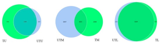 The OTUs that were exclusive to a given sample type included OTUs related to Tssierellales (Peptostreptococcales), Peptostreptococcaceae, Romboutsia, Romboutsia illealis, Paeniclostridium, Paeniclostridium sordellii, Burkholderales, Tepidiphilus and Clostridium perfringens in the TU samples; Enterobacterales, Enterobacteriaceae, Escherichia–Shigella, Escherichia coli, Lactobacillus johnsonii, Enterococcus, Enterococcaceae, Enterococcus durans and Lactobacillus oris in the TM samples; Oscillospiraceae, Rikenallaceae, Alistipes, Clostridia UCG 014, Vampirivibronia, Gastranaerophilales and Cyanobacteria in the TL section; Lactobacillales, Bacilli, Lactobacillaceae, Lactobacillus aviarius, Corynebacteriales, Corynebacteriaceae and Corynebacterium in the UTU; Aeromondales, Aeromonadaceae and Aeromonas in the UTM; and Clostridia, Lachnospiraceae, Oscillpspirales, Ruminococcaceae, Bacteroidales, Bactroidota, Faecalibacterium, Bacteroides, Bacteroidaceae, Bacteroides dorei, Clostridia vadinBB60 group, Blautia, Ruminococccus torques group, Subdoligranulum, Parabacteroides, Tannerellaceae, Parabacteroides distasonis and Erysipelotrichales in the UTL samples.