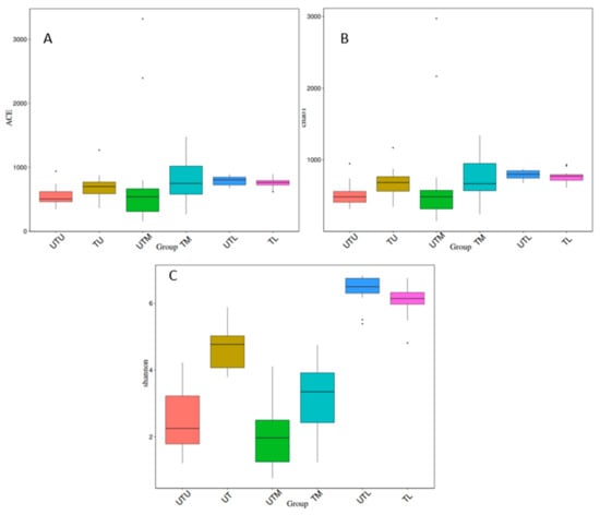Boxplots depicting three alpha diversity indices. (A) Depicts the ACE index, (B) depicts the Chao1 index and (C) depicts the Shannon index.