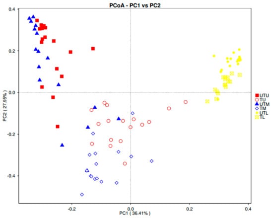 A weighted UniFrac PCoA plot was used to measure the beta diversity (the number of taxonomic units that are not the same in two different sample types) (Figure 5).