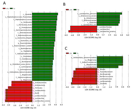 Linear discriminant analysis effect size (LEfSe) illustrating the OTUs responsible for differentiating sample groups from one another. (A) UTU vs. TU, (B) UTM vs. TM, (C) UTL vs. TL.