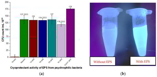 (a) Cryoprotectant activity of EPS isolated from psychrophilic bacteria in comparison with glycerol and control. (b) Cryoprotective role for CUI-P1 EPS in increasing the shelf life of E. coli strain caging HriGFP protein.