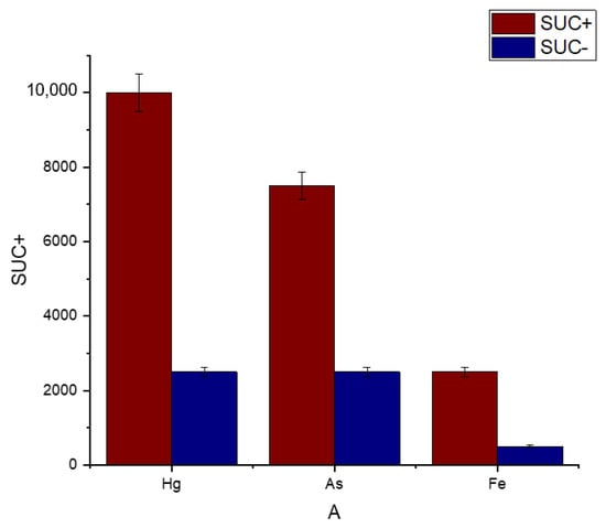 To check the metal tolerance activity of Acinetobacter sp., it was grown on the LB agar plate with different heavy metal concentrations (enriched and non-enriched 5% sucrose). The result depicted that Acinetobacter sp. survived much better on LB agar containing 5% sucrose and a high heavy metal concentration than on control media (without sucrose). In the media where sucrose was present, bacteria were able to produce exopolysaccharides and talented to tolerate mercury, arsenic, and iron up to 10,000, 7500, and 2500 ppm, respectively, which was significantly higher than metal tolerance in LB medium without sucrose (Mercury 2500, Arsenic 2500, and Iron 500 ppm). Interestingly, it was found that when psychrophilic bacteria have an EPS shield around them, they tolerate mercury up to 10,000 ppm, arsenic at 7500 ppm, and iron at 2500 ppm, which is significantly high resistance when compared with bacteria without a shield; resistance was in the order Hg > As > Fe (Figure 3). To analyze the statistical significance of metal tolerance between SUC+ and SUC− strains for Hg, As, and Fe, a two-sample t-test can be performed. The p-values for all three metals were less than 0.05, indicating that there is a significant difference in metal tolerance between the SUC+ and SUC− strains. Specifically, the strain in presence of sucrose has a higher metal tolerance than the SUC− strain. These results suggest that the EPS produced by strain CUI-P1 may play a role in metal tolerance.