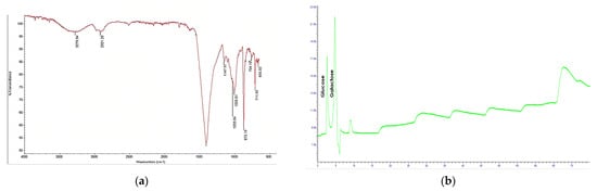 The FTIR spectra of the EPS-P1 have been depicted in Figure 4a. A variety of peaks were observed, ranging from 3279 to 666 cm−1. The vast stretch at 3279.94 cm−1 has been attributed hydroxyl group from polysaccharides [], and the peak at 2925 cm−1 has been attributed to C-H []. Peaks between 1000 and 1200 cm−1 are confirmatory peaks of the polysaccharide nature of the material [,]. Stretching at 1008.81 cm−1 indicates C-O linkage from the alcohol group, whereas the small peak at 1147.97 has been attributed to asymmetric stretching owing to the O-C-O group []. The characteristic extended at 1454.12 cm−1 was allied to the symmetrical COO-link vibrations [].