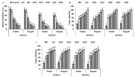 (a) The disease suppression efficacy of green synthesized silver nanoparticles against the early blight of tomato plants at vegetative and reproductive stages during the pot experiment: (a) disease incidence (%); (b) number of lesions/plant (%); and (c) lesion size (%). Bars with different lower-case letters are significantly different at p ≤ 0.05 (Duncan’s multiple range test). Vertical bars indicate standard error (SE) values.