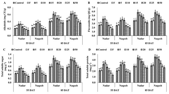 Silver nanoparticles improved the growth of plants and affected the production of various essential biochemicals such as alkaloids, total flavonoids, total soluble sugar, and total soluble protein (Figure 3).