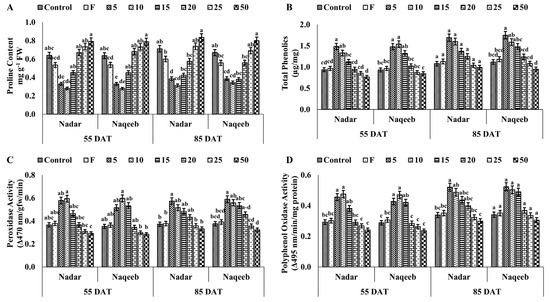 To assess the peroxidase (PO) activity of treated plants, the Fu and Huang [62] methodology was employed. A total of 470 nm/g fresh weight/minute was used to express the activity of PO. Leaf samples (0.2 g), completely washed, were kept frozen using liquid nitrogen and were crushed with mortar and pestle in 5 mL of 100 mM phosphate buffer solution until homogenized. The solution was then centrifuged for 25 min at 12,000 rpm. The obtained supernatant was taken in a beaker and allowed to react with 20 μL of 40 mM hydrogen per oxide. The oxidation of guaiacol was noted at 470 nm min−1 with the help of a spectrophotometer.