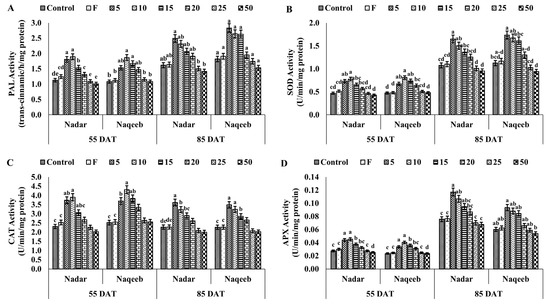 Silver nanoparticles produced more phenolic content, PO, PPO, PAL, CAT, SOD, and APX to reduce the pathogenic stress in plants. The higher concentrations of AgNPs caused more stress in plants than in the control, producing a higher amount of proline. A lower amount of proline was detected in plants treated with lower concentrations (5–10 ppm), indicating stress reduction, as shown in Figure 4b. The maximum phenolic contents of 1.483 µg mg−1, 1.479 µg mg−1, 1.691 µg mg−1, and 1.750 µg mg−1 were quantified in plants of both varieties treated with 5 ppm AgNPs at 55 and 85 DAT, respectively. The PO activity was also improved in both varieties of tomato with the exposure to lower concentrations of AgNPs compared to the control. More PO activity was observed in plants of the nadar and naqeeb varieties at 55 DAT than 85 DAT, suggesting that the exposure to AgNPs inhibits the pathogen attack, resulting in the production of less reactive oxygen species (ROS), lowering the PO activity. A similar trend was observed in PPO activity, as shown in Figure 4d. The PPO activity ranged from 0.241 to 0.475 in plants of the nadar variety, from 0.236 to 0471 in plants of the naqeeb variety at 55 DAT, from 0.299 to 0.520, and from 0.306 to 0.523 in plants of nadar and naqeeb varieties at 85 DAT, respectively.