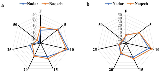 Figure 3c shows the significant change in total soluble sugar production in both varieties of tomato plants. The maximum production of total soluble sugar was 0.724 mg g−1 and 0.805 mg g−1 in plants of the nadar and naqeeb variety, respectively, using 10 ppm AgNPs, which was more than 60% compared to the control at 55 DAT. The production of total soluble sugar was improved with further treatments of AgNPs in both varieties at 85 DAT. The higher concentrations of AgNPs reduced its production compared to the control.
