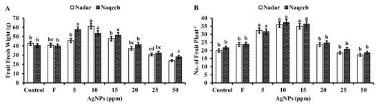 The effect of green synthesized silver nanoparticles on yield parameters of tomato plants: (A) fruit fresh weight and (B) number of fruit/plant. Bars with different lower-case letters are significantly different at p ≤ 0.05 (Duncan’s multiple range test). Vertical bars indicate standard error (SE) values.