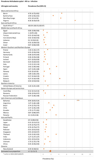 - Country H. pylori–HIV co-infection prevalence was estimated by multiplying country HIV prevalence by country H. pylori prevalence.
