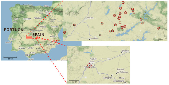 Outbreaks of B. anthracis in west central and central Spain from August 19 to 14 December 2021. A map of Spain is shown (center-left image) with close-ups of the two outbreak regions. The first outbreak took place near the city of Ciudad Real (lower-right image), and the second covered several villages in the Extremadura region (upper-right image). Red circles indicate the location of the affected farms, numbered chronologically by the start date of the outbreaks (Extremadura map) or alphabetically (Ciudad Real map). For details of these outbreaks, see Table S1. Data were extracted from the Spanish reports sent to the OIE (https://www.woah.org/). Map tiles by Stamen Design, under CC BY 3.0 license. Data from OpenStreetMap, under ODbL.