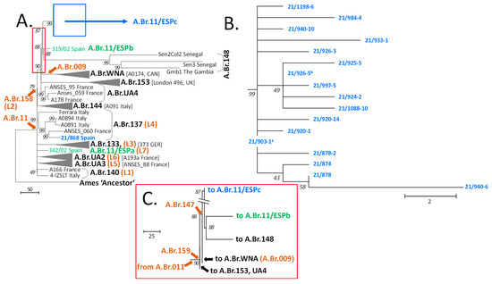 Rooted phylogenetic tree of Spanish B. anthracis and representatives of the A.Br.011/009 canonical single-nucleotide polymorphisms (canSNP) clade derived from chromosomal SNP analysis. A total of 1817 chromosomal SNPs were used to construct a maximum parsimony tree (bootstrap confidence values were generated from 500 permutations). (A) Overview tree to illustrate the general positions of Spanish strains within the A.Br.011/009 phylogeny. (B) Close-up of the diversity of new branch A.Br11/ESPc. (C) Close-up of branching after canSNP A.Br.159. To indicate the positions of additional branches, these are drawn as condensed down to a single representative (grey wedges with strain names in brackets). Branch names or relevant canSNP positions are set in black or brown bold characters, respectively. Previously identified Spanish strains and branches are colored in green and new strains and clades in blue. All other relevant isolate names and countries of origin are indicated at branch termini. The red and blue boxes in panel A indicate the sections shown in detail in panels B and C. The tree is rooted to the B. anthracis reference strain Ames ‘Ancestor’, which belongs to the A.Br.Ames clade. a identical chromosomal sequence to isolates 21/890-8; 21/890-9; 21/903-6; 21/905-13; 21/918-3; 21/926-9; 21/926-22; 21/940-19 and 21/955-9; b identical chromosomal sequence to isolates 21/891-2 and 21/1088-3.
