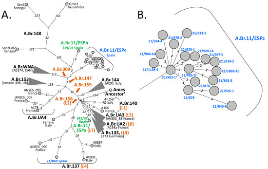 The hypothetical base of the lineage leading to branch A.Br.11/ESPb (strain 319/02 from Spain) was only two SNPs distant from the base of clade A.Br.11/ESPc (Figure 3A). Strain 319/02 had been isolated in Guadalajara province approx. 260 km away from Talarrubias (Badajoz) and 19 years earlier than strain 21/903-1. Clearly, lineages A.Br.11/ESPb and A.Br.11/ESPc share a common, probably relatively recent, ancestor. Notably, the base of these two purely Spanish lineages (A.Br.11/ESPb and A.Br.11/ESPc) also gave rise to the West African lineage A.Br.148 (Figure 3A).