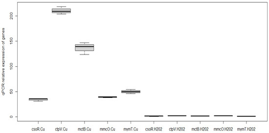 All genes showed an increase in expression (2−ΔΔCt) when treated with copper ions in contrast to those treated with H2O2, as estimated by qPCR (csoR gene: 34.37, ctpV gene: 210.43, mctB gene: 136.59, mmcO gene: 39.31, mymT gene: 50.19 with copper ions versus csoR gene: 1.28, ctpV gene: 1.28, mctB gene: 1.81, mmcO gene: 2.13, mymT gene: 1.04 treated with H2O2), with the genes that code for efflux proteins (ctpV and mctB) being those that showed the greatest difference in expression compared to those treated with H2O2 (Figure 2).