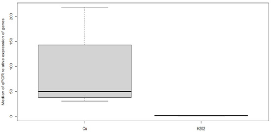 In addition, the median value of copper homeostasis gene expression was significantly higher (p < 0.05) in MAP cells subjected to copper ion treatment than it was in H2O2-stressed MAP cells (Figure 3).
