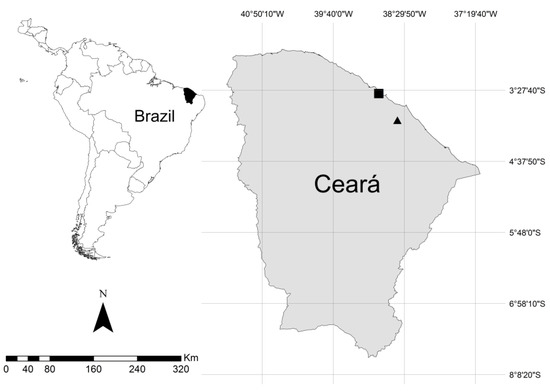Geographical location of the collection sites; the square mark represents Fazenda Maceió-Taíba, and the triangle mark represents RPPN Monte Alegre.