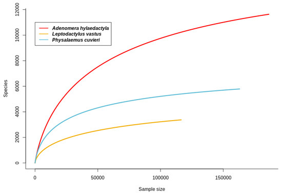 A total of 20 foam nest 16S rRNA libraries were sequenced from the studied frog species: 8 from A. hylaedactyla, 5 from L. vastus, and 7 from P. cuvieri. After filtering out low-quality and short-sequence reads, a total of 774,363 raw sequences were obtained, with an average of 38,718 sequences/sample (ranging from a maximum of 86,865 to a minimum of 26,711). The largest variation was observed in the samples of A. hylaedactyla, ranging from a maximum of 86,865 to a minimum of 26,711, with an average of 42,209. The samples from L. vastus showed less variation (ranging from a maximum of 67,934 to a minimum of 23,287, with an average of 45,246), as did the samples of P. cuvieri (ranging from a maximum of 39,044 to a minimum of 23,433, with an average of 30,066). The rarefaction curves for the observed amplicon sequence variants (ASVs) approached the asymptotes, indicating that the sequencing and sampling efforts adequately captured the taxonomic diversity within each sample (Figure 3).