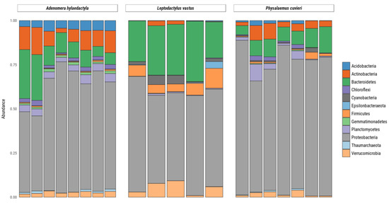In A. hylaedactyla, the most frequent phyla were Proteobacteria (60.3%), with the majority belonging to the class Gamma-proteobacteria (56.6%) and a small proportion belonging to Alpha-proteobacteria (3.7%). The next most abundant phyla were Bacteroidetes (11%) and Actinobacteria (6.1%). In L. vastus, there was a predominance of Proteobacteria (58.2%), including Gamma-proteobacteria (42.9%) and Alpha-proteobacteria (15.3%). The next most abundant phyla were Bacteroidetes (26.9%) and Firmicutes (7.3%). The nests of P. cuvieri were predominantly composed of Proteobacteria (72.8%), primarily from the Gamma-proteobacteria class (71.2%) with a small contribution from Alpha-proteobacteria (2.0%) and Bacteroidetes (8.5%).