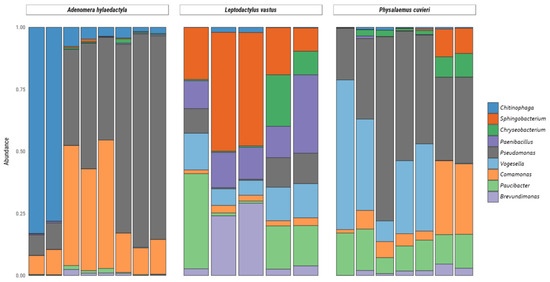 It is noteworthy that some bacterial genera such as Pseudomonas, Vogesella, Chryseobacterium, Chininophaga, Paenibacillus, Comamonas, Paucibacter, Brevundimonas, and Sphingobacterium were the most abundant genera in the nests of the three frog species, comprising more than 10% of all bacterial taxa observed (Figure 5).