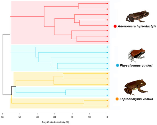 To assess the bacterial beta diversity, the unweighted pair-group method with arithmetic mean (UPGMA) was carried out using the Bray–Curtis algorithm. The differences among the samples were further confirmed via clustering analysis. The analysis showed that the bacterial genus level ASVs were grouped into two main clusters (Figure 6). One cluster subdivided into two clear subgroups, one containing all replicates of A. hylaedactyla and the other containing most replicates of P. cuvieri. The second main cluster subdivided in two subgroups, one consisting of three L. vastus replicates and two P. cuvieri replicates, indicating similarity between them, while the other group only consisted of L. vastus replicates.
