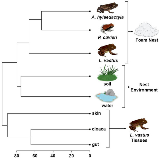 The UPGMA dendrogram was used to access the differences between foam nests, nest environments, and host tissues to understand their relationships. The analysis revealed two main clusters, the first of which was divided into two subgroups, one containing foam nests and the other containing environmental samples. The second major group consisted solely of L. vastus tissue samples, with skin grouped separately from gut and cloaca microbiomes (Figure 7).