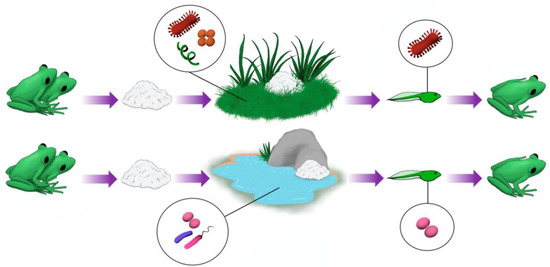 McGrath-Blaser et al. have already demonstrated the presence of an exclusive bacterial community that colonizes frog foam nests [12]. These foam nests, produced by rhacophorid frogs, present a unique bacterial structure distinct from the environment, skin of tadpoles, and skin and cloaca of adult frogs. Although the structure of the foam nests is unique, some components of this community have already been reported as originating from the environment or the skin and digestive tract of adult frogs, suggesting that foam nests acquire their microbial communities from these sources.